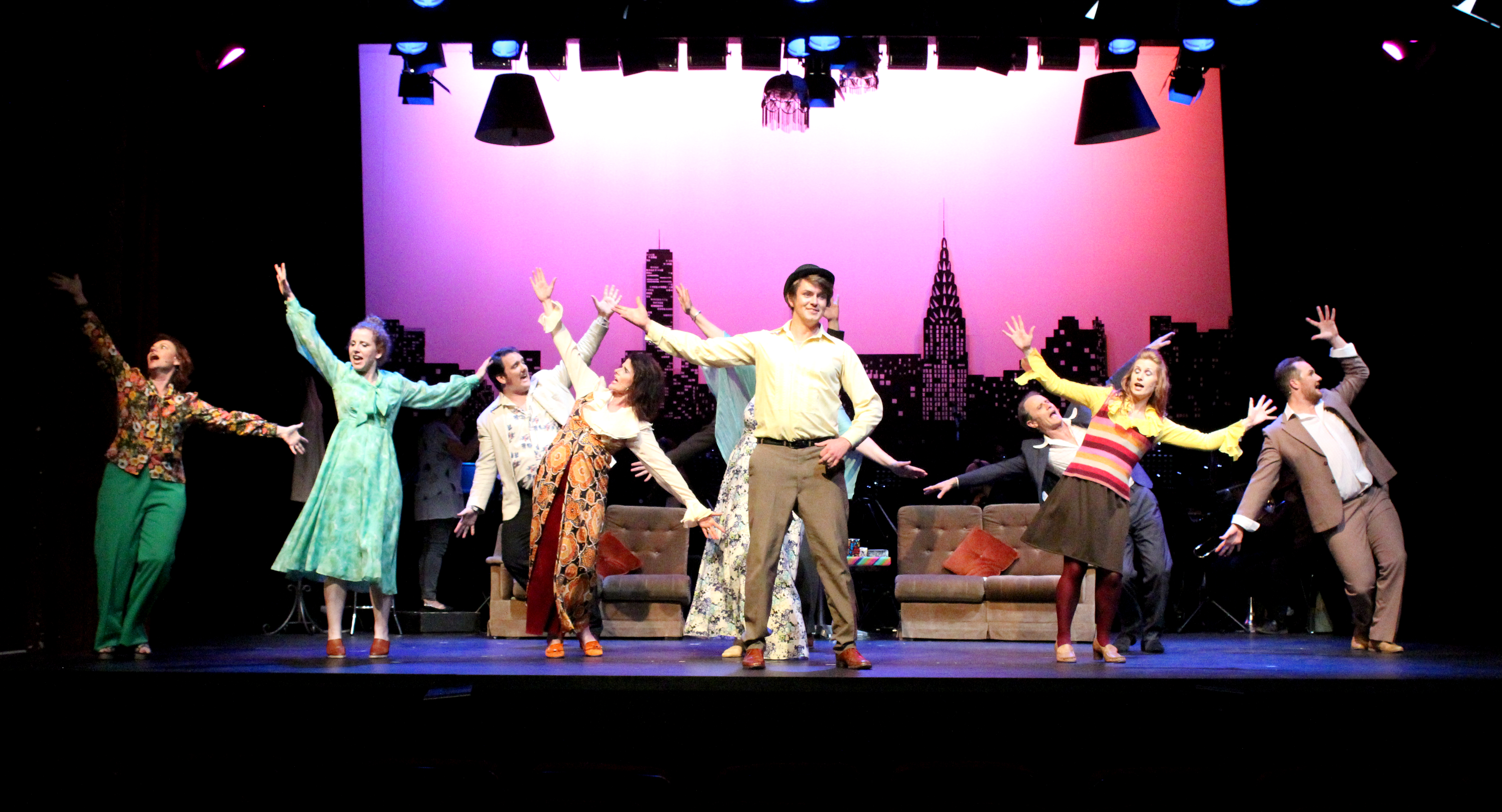 From the building rhythm of the opening number as it segued into the title song, I got a wave of goosebumps all over my arms. The harmonies were spot on, the timing was tight; this was serious, folks. Not just a top effort, but the real deal. The show opened on Broadway in 1970 and last night proved once again that its themes of love, partnership, fidelity, selfishness and loneliness are still universal. The set was simple and effective, with the orchestra seated on stage between the actors and the New York skyline backdrop. An excellent choice! I thoroughly enjoyed being able to see the musicians, while they never took our eye off the central action.
